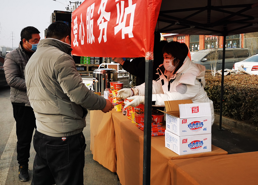 “這不都要過年了,周圍好多餐飲店也關門了,我們吃飯也不方便,這不給我們免費的方便面,還有熱水,我在車上就把飯吃了,很貼心。”來自張家口的物流司機王強表示,“正好,吃口熱乎的,車也裝滿了,我下午就到張家口了。”