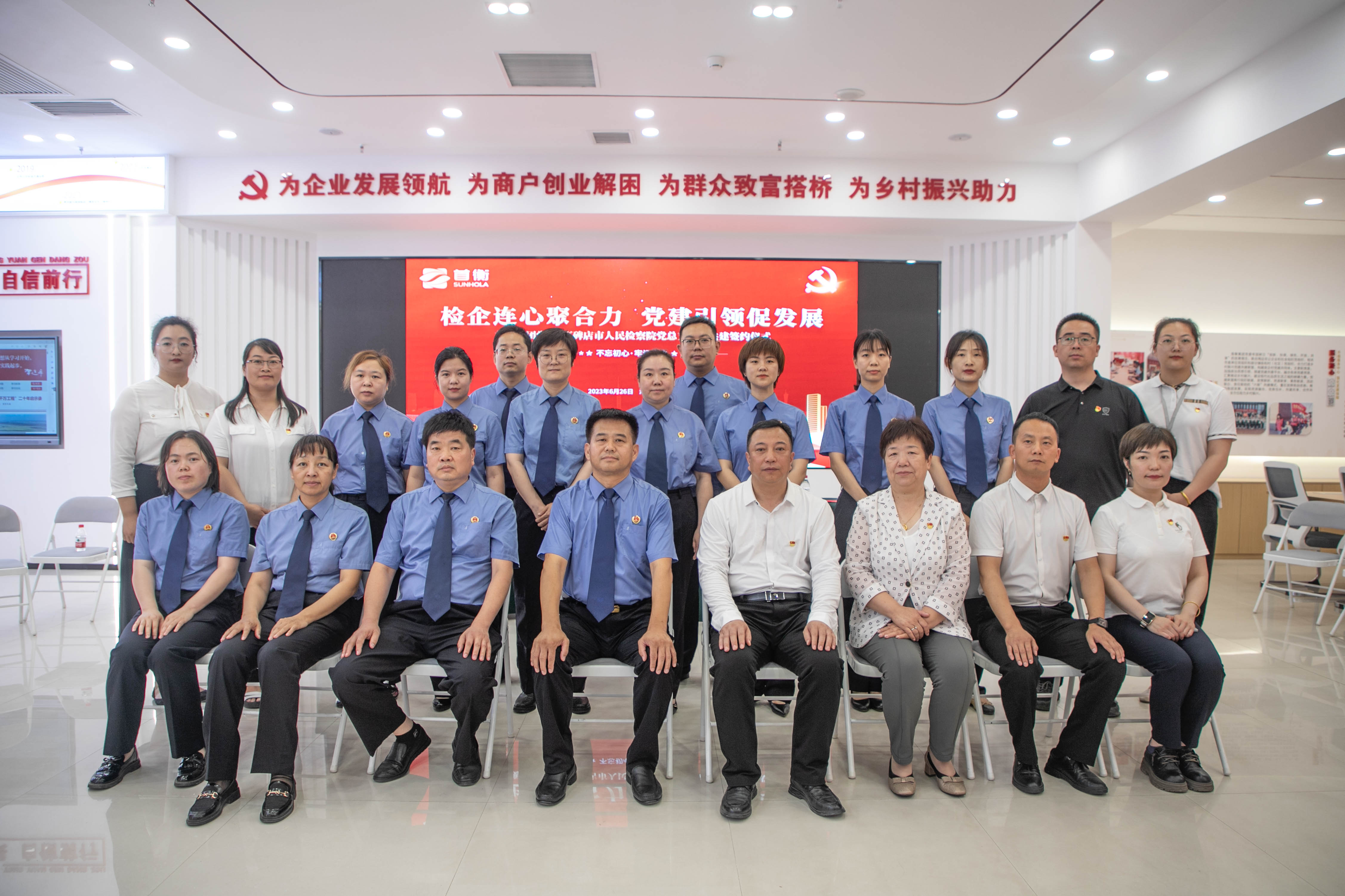 為深入學習貫徹習近平新時代中國特色社會主義思想和黨的二十大精神,落實新時代黨的建設總要求,促進檢企合力共建,在中國共產黨102周年華誕即將到來之際,6月26日下午,首衡集團黨委和高碑店市人民檢察院黨總支開展“檢企連心聚合力,黨建引領促發展”為主題的黨建共建簽約儀式。首衡集團黨委書記、總裁魏樹儉和高碑店市檢察院黨組書記、檢察長王進文出席儀式,來自兩個黨組織的30余名黨員和首衡集團審計監察中心相關負責人共同參加活動。
